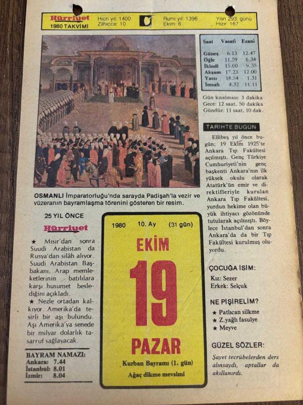 19 EKİM 1980 - TAKVİM YAPRAĞI - DOĞUM GÜNÜ HEDİYESİ - HÜRRİYET TAKVİMİ - DESTAN GİBİ ADLI ROMAN - Eski Başbakanlardan Şemsettin Günaltayın ölümü - Ankara Tıp Fakültesi'nin açılışı (1925) - 2. Murat'ın Kosova Zaferi (1448) başlıklı ürün, Efemera, Müzik, Sinema > Belge ve Evraklar > Takvimler kategorisi altında İkinci El olarak satılmaktadır.