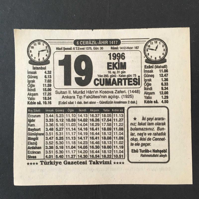 19 EKİM 1996 -TAKVİM YAPRAĞI-DOĞUM GÜNÜ HEDİYESİ-TÜRKİYE GAZETESİ TAKVİMİ,2.MURAD IN KOSAVA ZAFERİ 1448,ANKARA TIP FAKÜLTESİNİN AÇILIŞI 1925,ALDIĞIMIZ FİYATA,İKİ YÜZLÜ YAZI,TAVŞAN