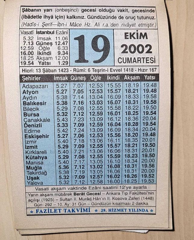 19 EKİM 2002 CUMARTESİ - TAKVİM YAPRAĞI - DOĞUM GÜNÜ HEDİYESİ - FAZİLET TAKVİMİ - ANKARA TIP FAKÜLTESİ'NİN AÇILIŞI (1925)-SULTAN 2.MURAD HAN'IN KOSOVA ZAFERİ (1448)-BERAT GECESİNDE İBADET, en son 6 ay önce güncellenmiştir.