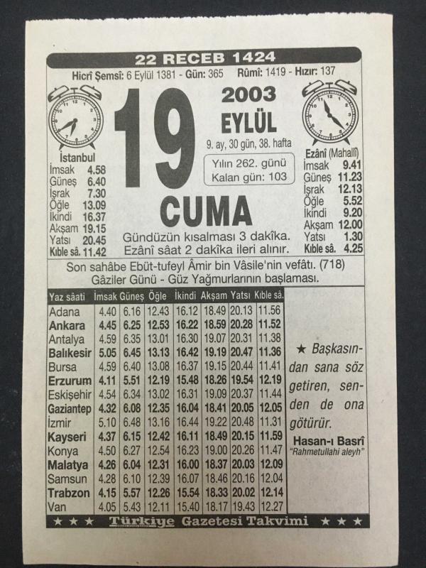 19 EYLÜL 2003-TAKVİM YAPRAĞI-DOĞUM GÜNÜ HEDİYESİ-TÜRKİYE GAZETESİ TAKVİMİ,SON HALİFE EBÜT TÜFEYL AMİR BİN VASİLENİN VEFATI 718,GAZİLER GÜNÜ ,GÜZ YAĞMURLARININ BAŞLAMASI, başlıklı ürün, Efemera, Müzik, Sinema > Belge ve Evraklar > Takvimler kategorisi altında İkinci El olarak satılmaktadır.