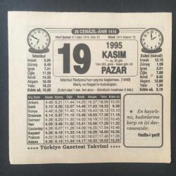 19 KASIM 1995 -TAKVİM YAPRAĞI-DOĞUM GÜNÜ HEDİYESİ-TÜRKİYE GAZETESİ TAKVİMİ,İSTANBUL RADYOSUNUN YAYINA BAŞLAMASI,1949,MERİÇ VE KEŞANIN KURTULUŞLARI,MANZUM ATASÖZLERİ ,DÜNKÜ CEVAP