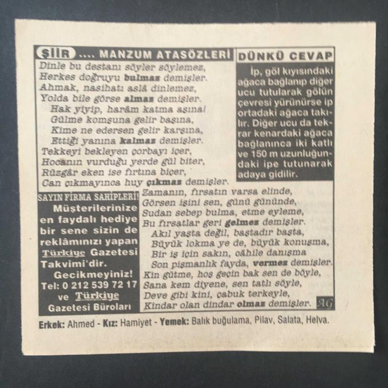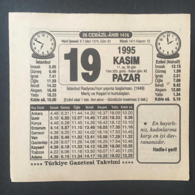 19 KASIM 1995 -TAKVİM YAPRAĞI-DOĞUM GÜNÜ HEDİYESİ-TÜRKİYE GAZETESİ TAKVİMİ,İSTANBUL RADYOSUNUN YAYINA BAŞLAMASI,1949,MERİÇ VE KEŞANIN KURTULUŞLARI,MANZUM ATASÖZLERİ ,DÜNKÜ CEVAP, en son 8 ay önce güncellenmiştir.