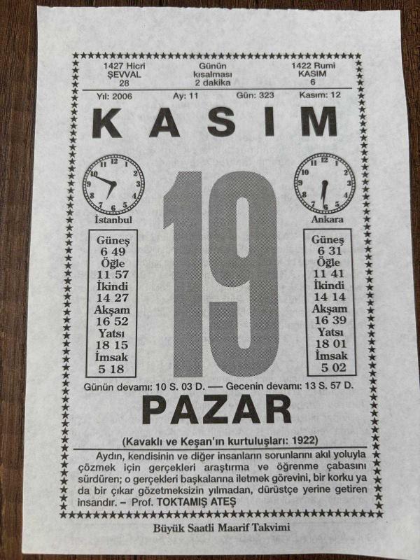 19 KASIM 2006 - TAKVİM YAPRAĞI - DOĞUM GÜNÜ HEDİYESİ - BÜYÜK SAATLİ MAARİF TAKVİMİ - PROF. TOKTAMIŞ ATEŞ - KADRİYE GÜLTEPE - İSMET İNÖNÜ TARAFINDAN İLK KOALİSYON KABİNESİ KURULDU - ÜNLÜ BESTECİ FRANZ SCHUBERT ÖLDÜ başlıklı ürün, Efemera, Müzik, Sinema > Belge ve Evraklar > Takvimler kategorisi altında İkinci El olarak satılmaktadır.