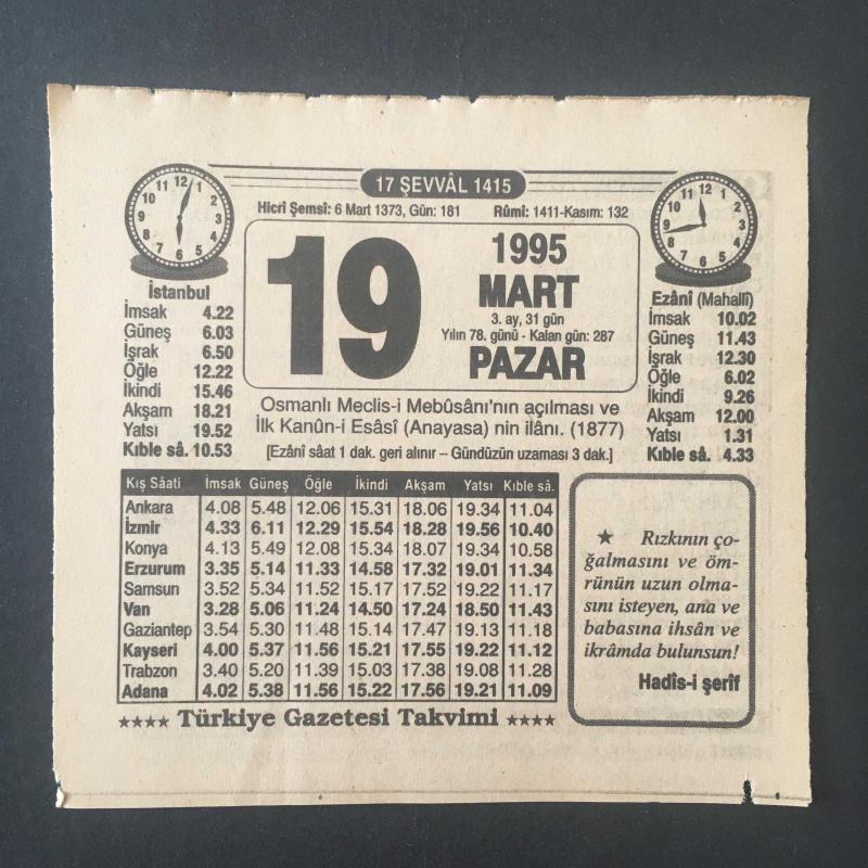 19 MART 1995 -TAKVİM YAPRAĞI-DOĞUM GÜNÜ HEDİYESİ-TÜRKİYE GAZETESİ TAKVİMİ,OSMANLI MECLİS İ MEBUSANIN AÇOLMASI VE İLK KANUNİ ESASİ NİN İLANI 1877,MANZUM ATASÖZLERİ ,TRAŞ, başlıklı ürün, Efemera, Müzik, Sinema > Belge ve Evraklar > Takvimler kategorisi altında İkinci El olarak satılmaktadır.