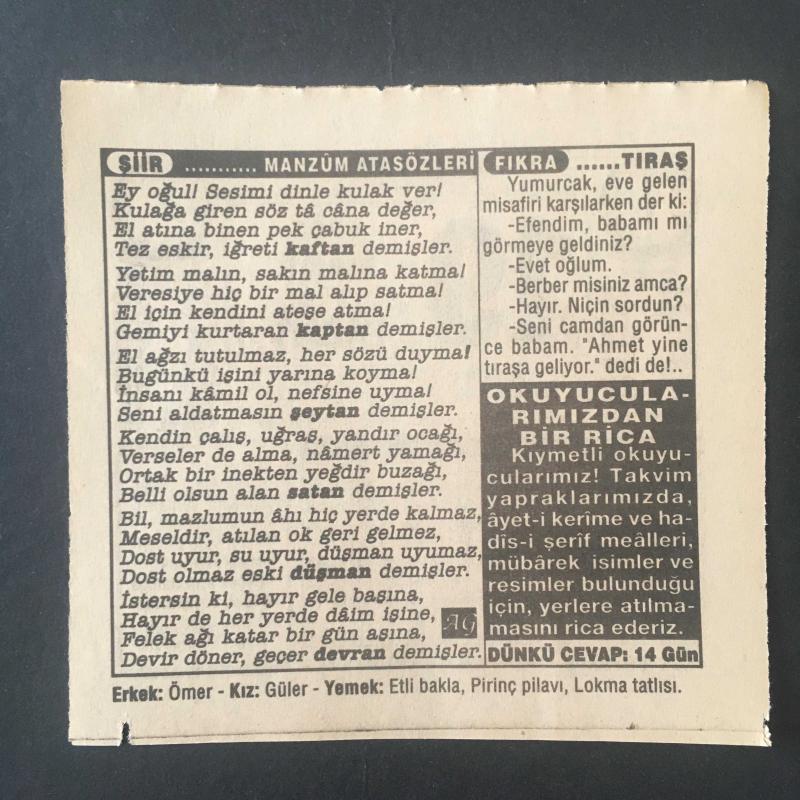 Gazeteler,dergiler,kitaplar harika hediyelerdir.Otantik,orijinal,nadir ve eski gazeteler,dergiler,kitaplar,efemeralar,objeler.Gazeteler bir aynadır.Kitaplar sadece okumak için değil birlikte yaşamak içindir . Kelimeler , notalar , sayılar kardeştirler.Kitaplar insanı binbir gözlü yapar.