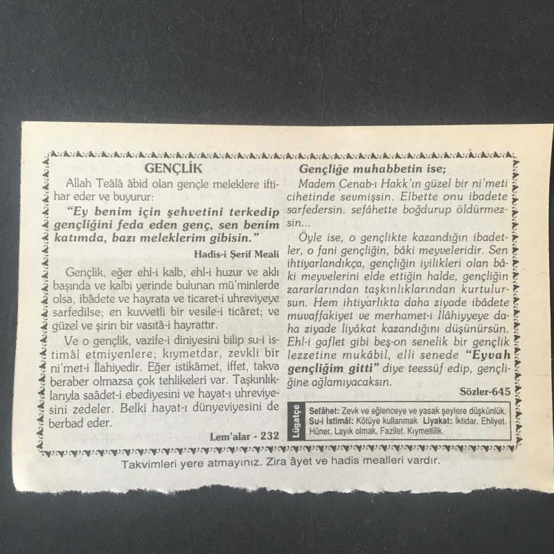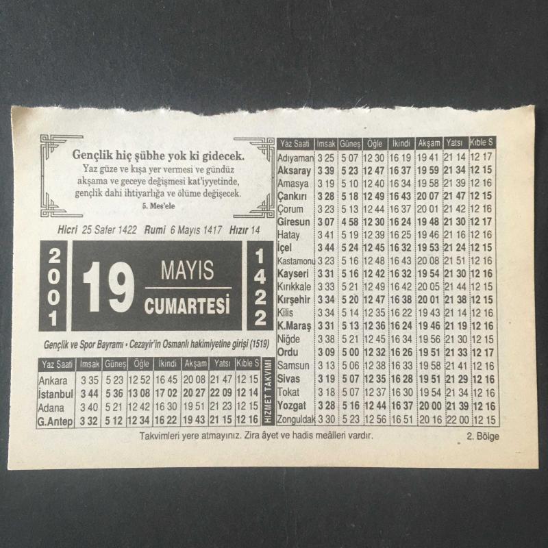 19 MAYIS 2001 -TAKVİM YAPRAĞI-DOĞUM GÜNÜ HEDİYESİ- HİZMET TAKVİMİ,GENÇLİK VE SPOR BAYRAMI,CEZAYİRİN OSMANLI HAKİMİYETİNE GİRİŞİ 1519,GENÇLİK, başlıklı ürün, Efemera, Müzik, Sinema > Belge ve Evraklar > Takvimler kategorisi altında İkinci El olarak satılmaktadır.