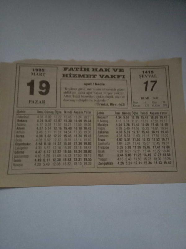 19 Mart 1995-Orijinal Takvim Yaprağı-Doğum Günü-Söz,Nişan,Nikâh,Düğün ve Önemli Günler Hediyesi-Fatih Hak ve Hizmet Vakfı-Ayet/Hadis(Tirmizi,Birr:662)-Dengesiz Beslenmenin Tehlikeleri-Sözün Özü-Havamatik.., en son 3 ay önce güncellenmiştir.