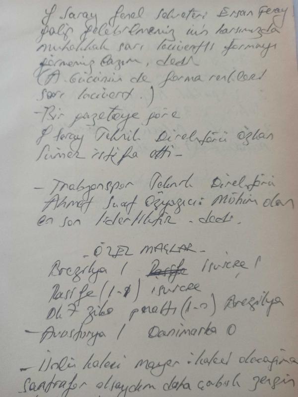 19 Mayıs 1982 - Galatasaray Genel Sekreteri Ersan Feray: ''Galip gelebilmemiz için karşımızda muhakkak sarı lacivertli formayı görmemiz lazım'' dedi haberi - Islak kalemle a4 kağıdına yazılmış bilgi notu - Tek Yaprak Arkalı Önlüdür adlı eser, Kitap > Süreli Yayınlar > Dergiler > Spor kategorisinde İkinci El olarak satıştadır.