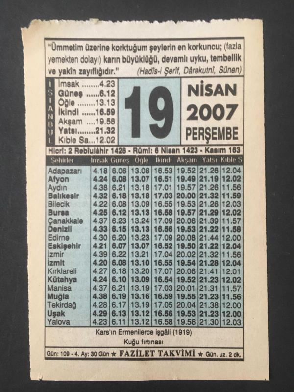 19 NİSAN 2007 -TAKVİM YAPRAĞI-DOĞUM GÜNÜ HEDİYESİ-FAZİLET TAKVİMİ,KARSIN ERMENİLERCE İŞGALİ 1919,KUĞU FIRTINASI,YEME İÇMENİN BAZI ADABI başlıklı ürün, Efemera, Müzik, Sinema > Belge ve Evraklar > Takvimler kategorisi altında İkinci El olarak satılmaktadır.