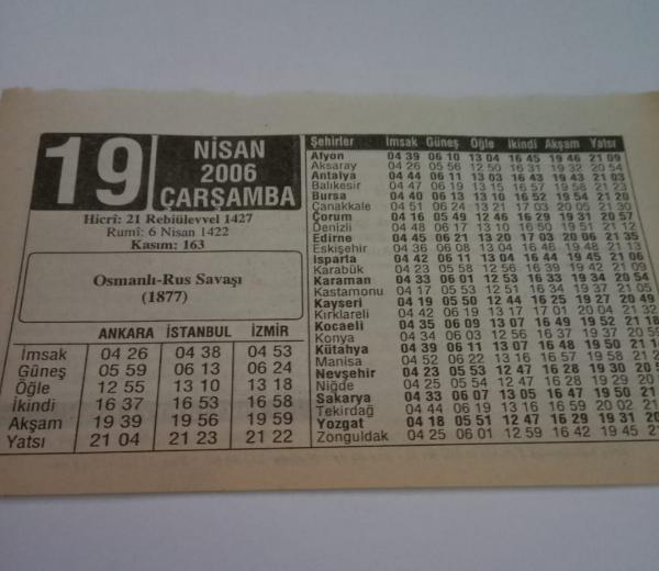19 Nisan 2006-Orijinal Takvim Yaprağı-Doğum Günü-Söz,Nişan,Nikâh,Düğün ve Önemli Günler Hediyesi-ERAŞ Hizmet Takvimi-Ayet-Hadis(Osmanlı-Rus Savaşı(1877))-Melek Nedir?-Çocuğunuza İsim:Özgür,Özge, en son 3 ay önce güncellenmiştir.