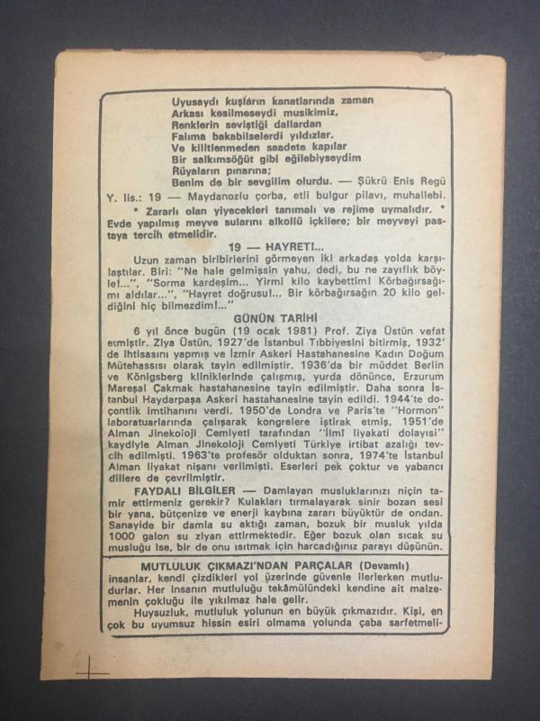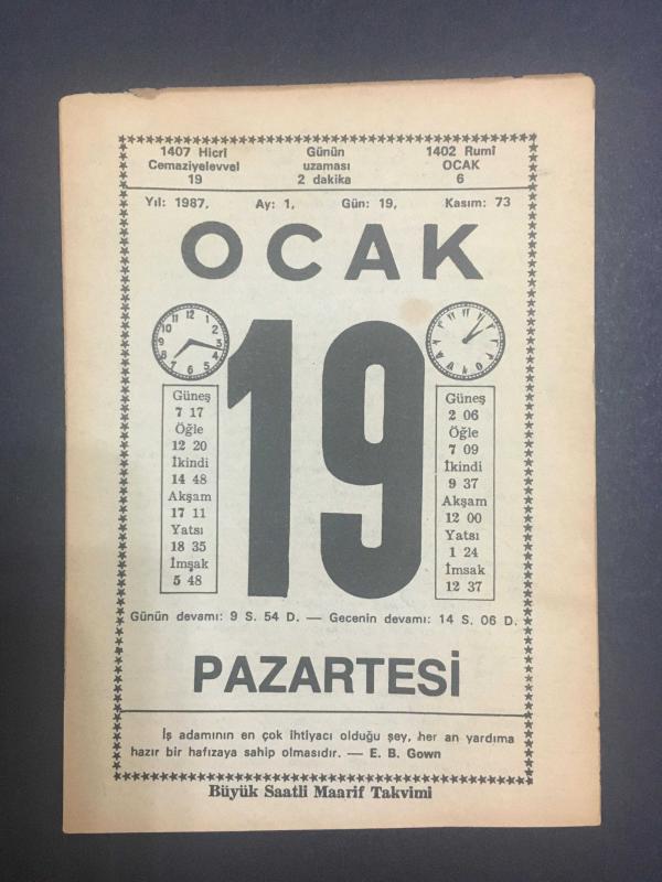 19 OCAK 1987 -TAKVİM YAPRAĞI-DOĞUM GÜNÜ HEDİYESİ-BÜYÜK SAATLİ MAARİF TAKVİMİ,HAYRET,PROF. ZİYA ÜSTÜNÜN VEFATI,FAYDALI BİLGİLER,MUTLULUK ÇIKMAZINDAN PARÇALAR, en son 8 ay önce güncellenmiştir.