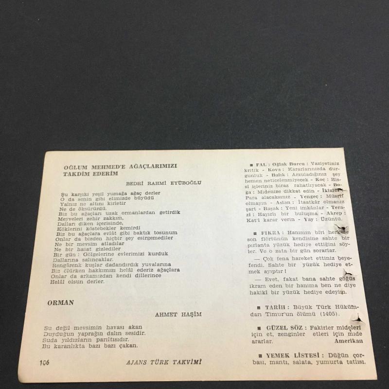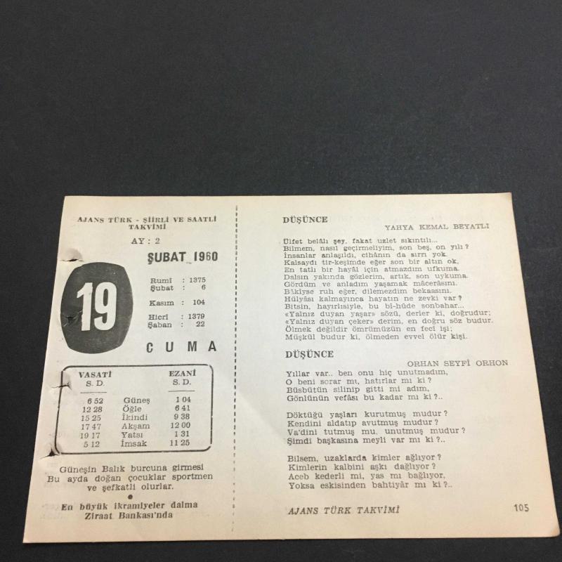 19 ŞUBAT 1960 -TAKVİM YAPRAĞI-DOĞUM GÜNÜ HEDİYESİ-AJANS TÜRK-ŞİİRLİ VE SAATLİ TAKVİMİ,YAHYA KEMAL BEYATLI,ORHAN SEYFİ ORHON,BEDRİ RAHMİ EYÜBOĞLU,AHMET HAŞİM,FAL,FIKRA,TİMURUN ÖLÜMÜ 1405,,GÜZEL SÖZ,YEMEK LİSTESİ, en son 8 ay önce güncellenmiştir.