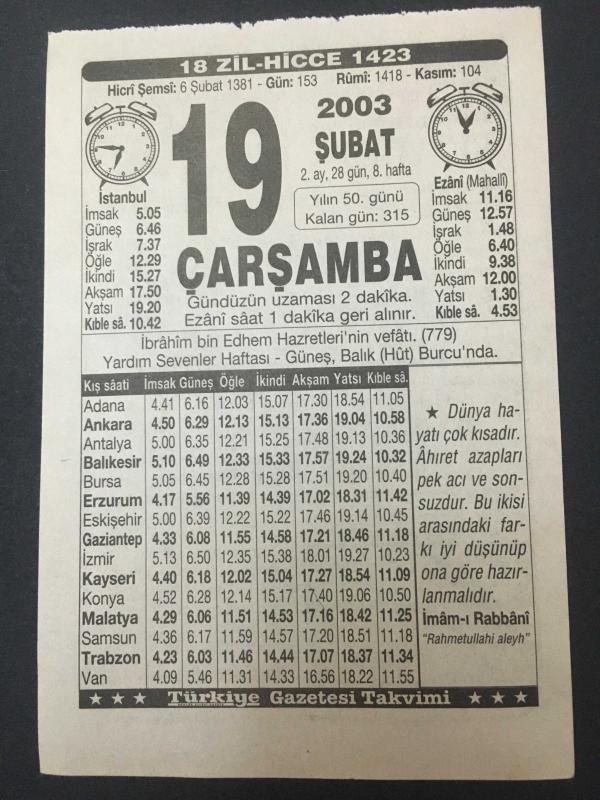 19 ŞUBAT 2003-TAKVİM YAPRAĞI-DOĞUM GÜNÜ HEDİYESİ-TÜRKİYE GAZETESİ TAKVİMİ,İBRAHİM BİN EDHEM HAZRETLERİ NİN VEFATI,779,YARDIM SEVENLER HAFTASI,HERİSE,VARLIK YOKLUK İÇİNDE YOKLUK ZEYTİN başlıklı ürün, Efemera, Müzik, Sinema > Belge ve Evraklar > Takvimler kategorisi altında İkinci El olarak satılmaktadır.