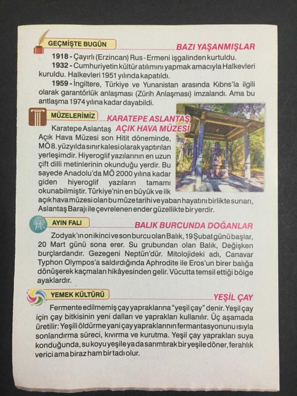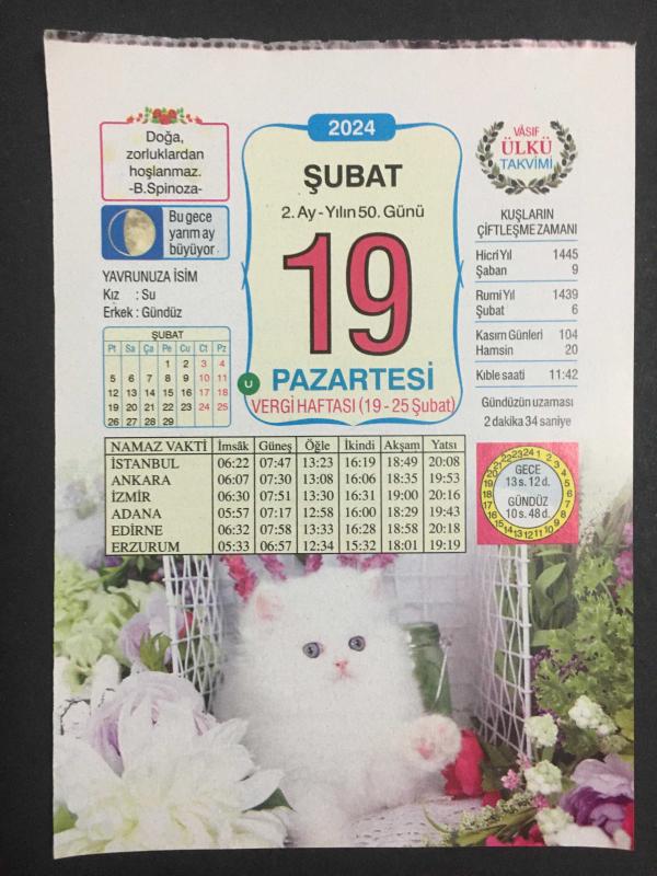 19 ŞUBAT 2024 -TAKVİM YAPRAĞI-DOĞUM GÜNÜ HEDİYESİ-VASIF ÜLKÜ TAKVİMİ,KEDİ,YAVRUNUZA İSİM,ÇAYIRLI RUS ERMENİ İŞGALİNDEN KURTARILDI,1918,HALKEVLERİ KURULDU İNGİLTERE TÜRKİYE YUNANİSTAN ARASINDA KIBRISLA İLGİLİ ZÜRİH ANTLAŞMASI YAPILDI ,KARATEPE ASLANTAŞ AÇIK HAVA MÜZESİ,BALIK BURCUNDA DOĞANLAR,YEŞİL ÇAY