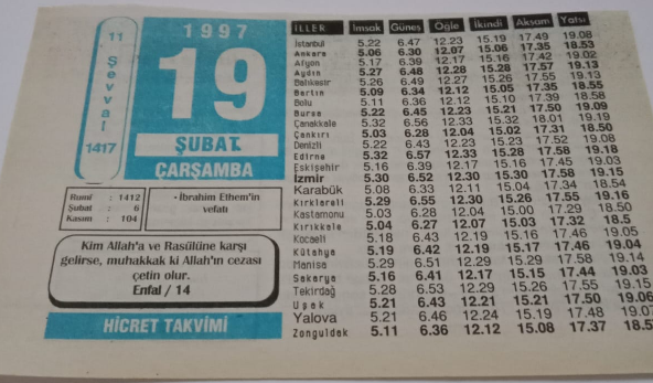 19 Şubat 1997-Orijinal Takvim Yaprağı-Doğum Günü-Söz,Nişan,Nikâh,Düğün ve Önemli Günler Hediyesi-Hicret Takvimi-Ayet(Hadis)-(Enfal/14)-TİBrahim Ethem'in Vefatı-İbrahim Ethem(K.S)-Allah(c.c.)Verdi, en son 24 gün önce güncellenmiştir.