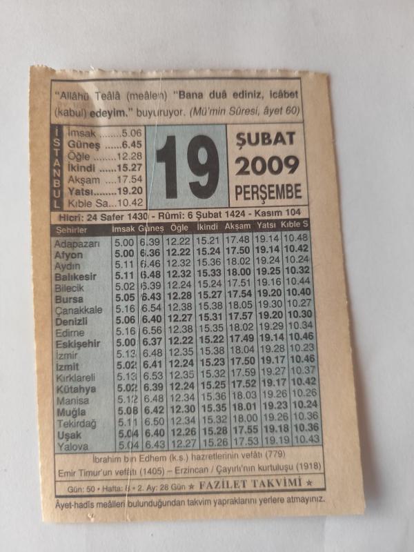 19 Şubat 2009-Orijinal Takvim Yaprağı-Doğum Günü-Söz,Nişan,Nikâh,Düğün ve Önemli Günler Hediyesi-Fazilet Takvimi-Ayet(Hadis)(Mü'min Suresi, ayet 60 )-İbrahim bin Edhem (k.s.) hazretlerinin vefatı (779)-Dualar Niçin Kabul Olmaz?-Bazı Tavsiyeler, en son bir ay önce güncellenmiştir.