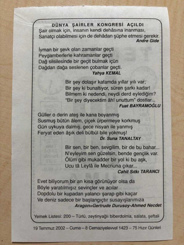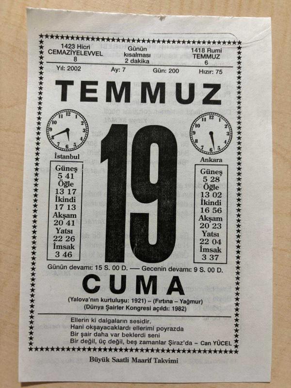 19 TEMMUZ 2002 - TAKVİM YAPRAĞI - DOĞUM GÜNÜ HEDİYESİ - BÜYÜK SAATLİ MAARİF TAKVİMİ - CAN YÜCEL - ANDRE GİDE - FUAT BAYRAMOĞLU - AHMET NECDET - DR. SUNA TANALTAY - YAHYA KEMAL, en son 8 ay önce güncellenmiştir.