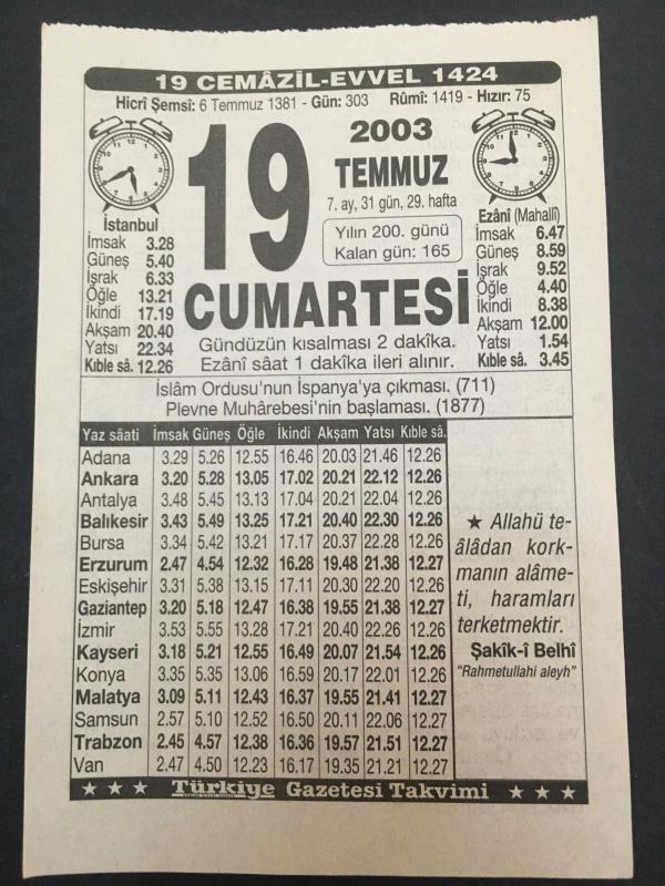 19 TEMMUZ 2003-TAKVİM YAPRAĞI-DOĞUM GÜNÜ HEDİYESİ-TÜRKİYE GAZETESİ TAKVİMİ,İSLAM ORDUSUNUN İSPANYAYA ÇIKMASI,711,PLEVNE MUHAREBESİNİN BAŞLAMASI 1877,TEMİZLİK, en son 8 ay önce güncellenmiştir.