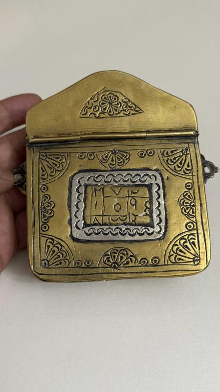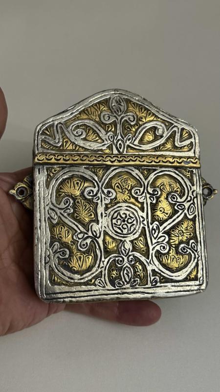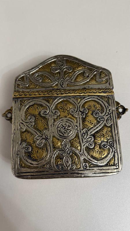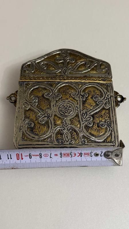 Arapça yazılı büyük ihtimale ayet dua Rumi ve hatayi motifleri Kabartma + kazıma teknik bir arada her iki yanında asma aparatlı kulakçıklar pirinç sıvama kakma işçilik detaylar aykırı formda gümüş kaplama kusursuz tertemiz kolaksiyonluk Nadide bir eser
