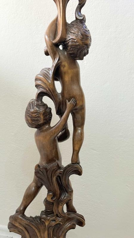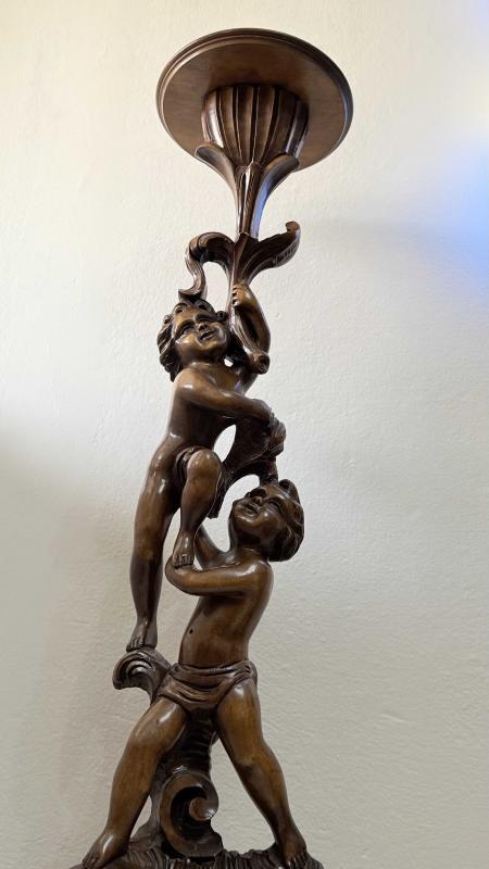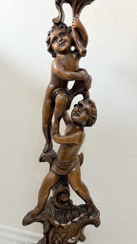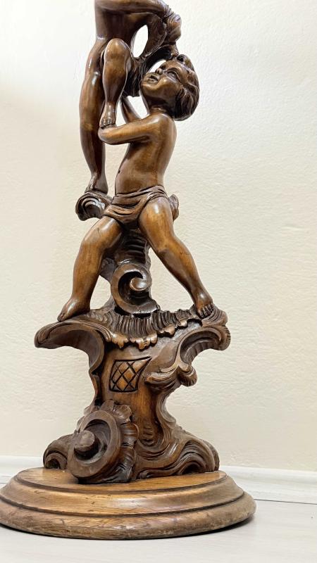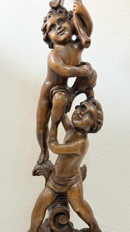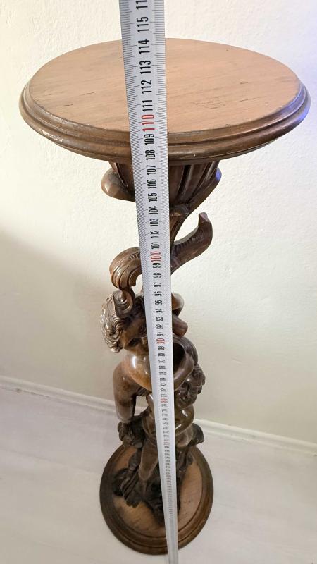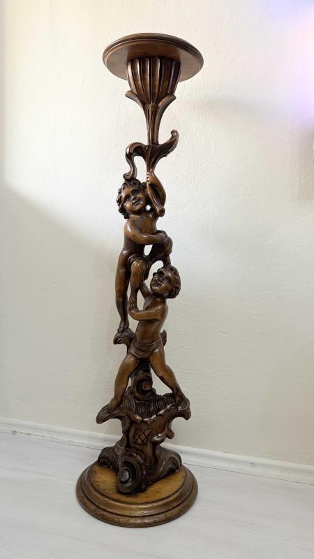 Çift melek figürlü tamamı el oyma sanatı yekpare masif ceviz ağacından 19 yüzyıldan kalma kusursuz noksansız tertemiz görsel şöleni vazolarınızı ev telefon saatlerinizi sergileye bileceğiniz Nadide antika bi eser