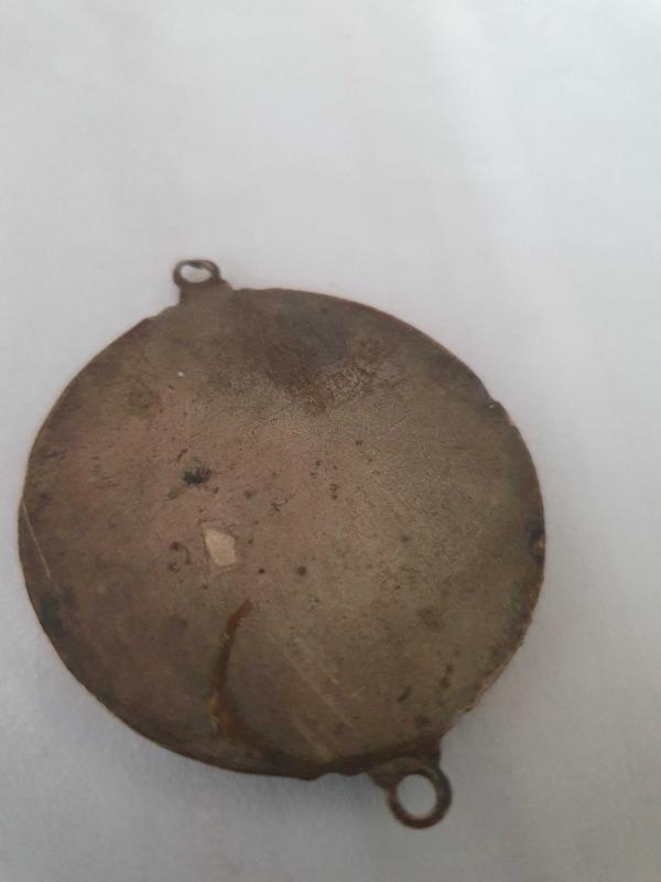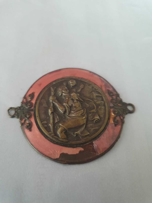Çift madalyon deliği var. bavula bağlanan bakır bronz karışımı ,kabartmalı, değerli ziynet ,pembe görünen sedef ,Hristiyan inancına göre yolculuk anında korunma amacıyla takılan madalyon