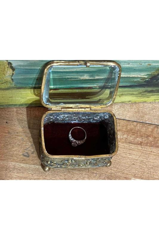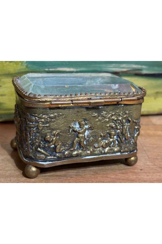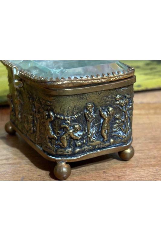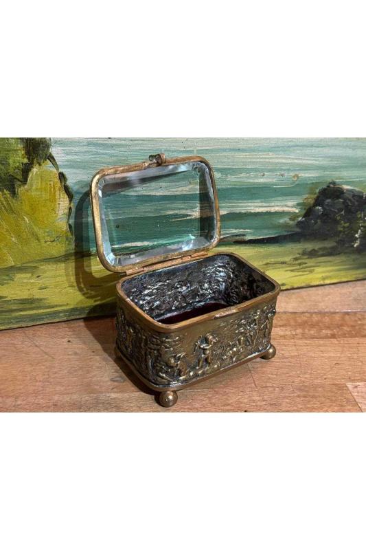 1900 Ler Başı Fransız Bizote Camlı Pirinç Mücevher Kutusu 8,5 Cm 6 Cm 5,5 Cm Ölçülerinde başlıklı antika/koleksiyon objesinin menşei belirtilmemiştir. Objenin ait olduğu dönem bilinmeketedir.