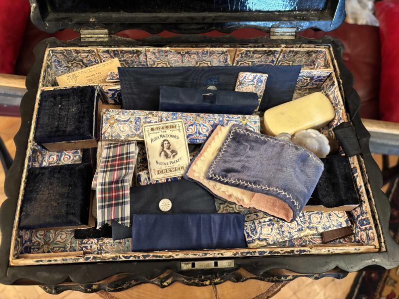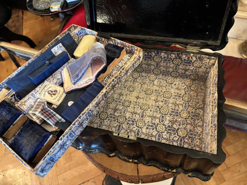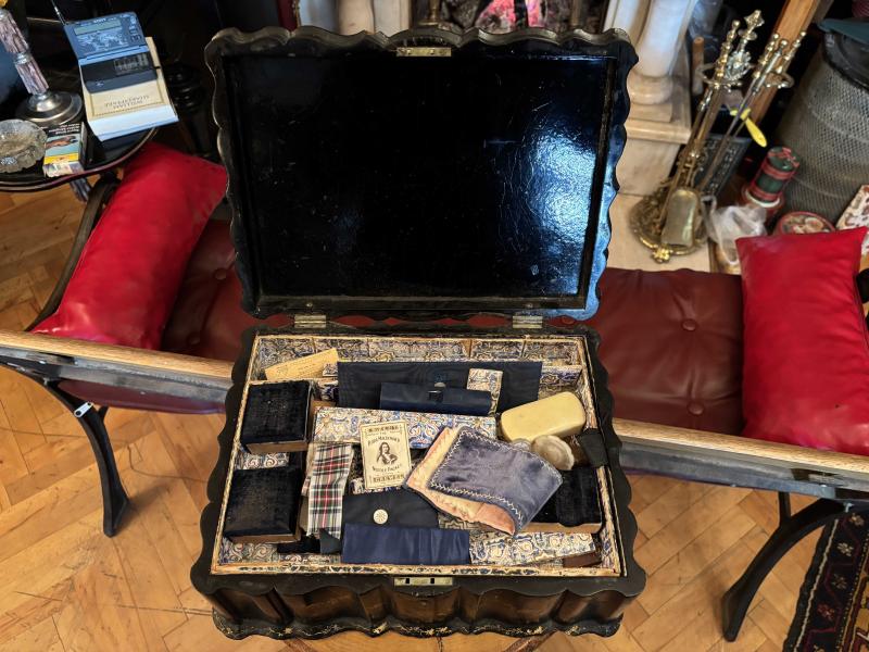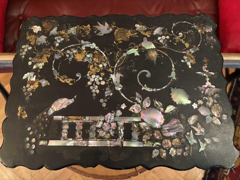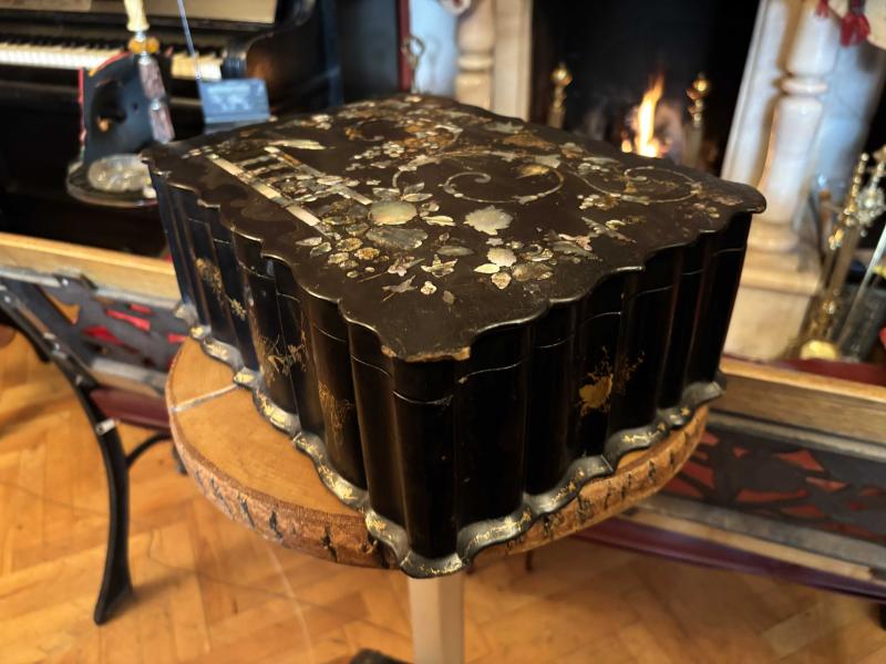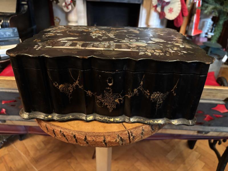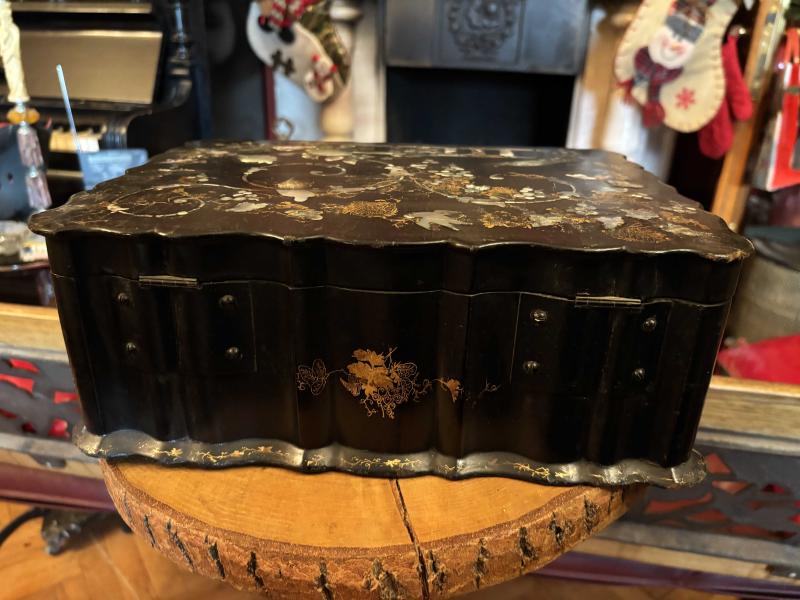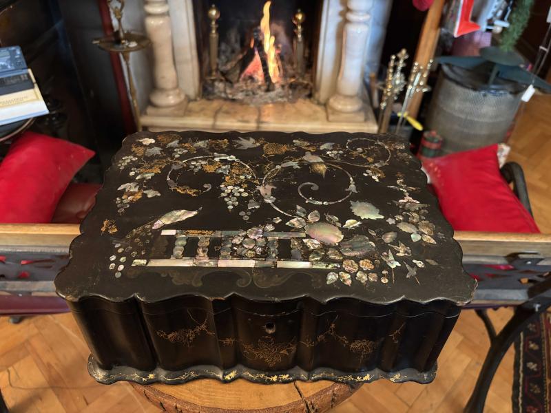 1900 başları Sedef işlemeli ingiliz dikiş kutusu 32 cm 23,5 cm 12 cm ölçülerinde başlıklı antika/koleksiyon objesi Avrupa menşe’lidir. 1900-1919 arası dönemine aittir.