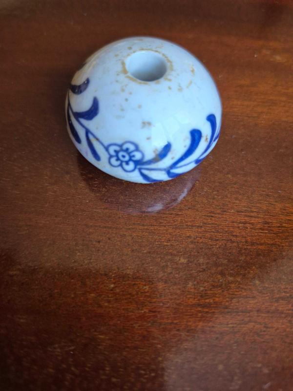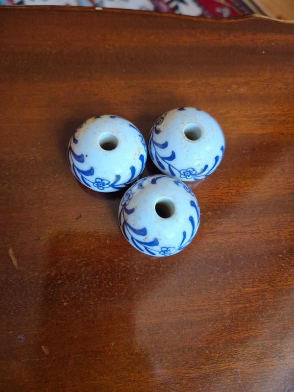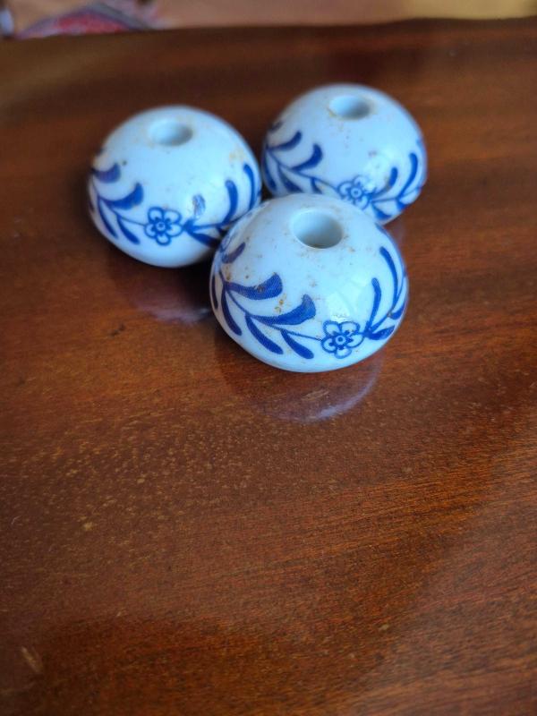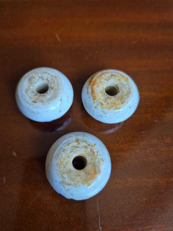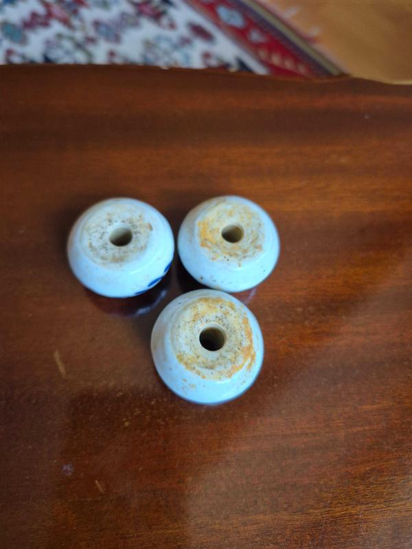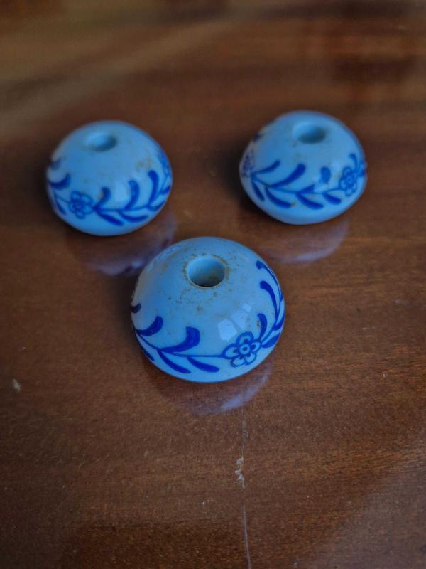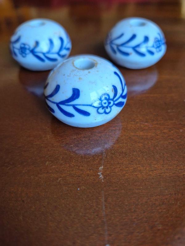 Osmanlı dönemi, oldukça eski, beyaz üzerine mavi çiçek süslemeli, 4 cm çapında, 3cm yüksekliğinde , 3 adet porselen dolap/çekmece kulpu, haliyle