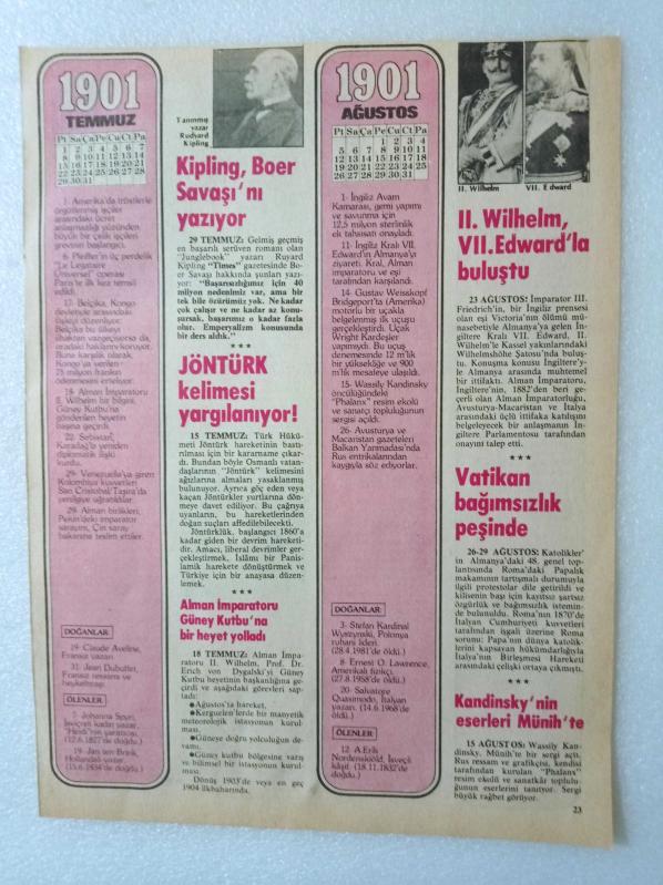 1901 = ( Temmuz-Ağustos-Eylül ) - Jöntürk kelimesi yargılanıyor • Vatikan bağımsızlık peşinde • Motorlu araçlar tescil edilecek • Mc Kinley'e suikast • Pekin'de barış ~ [ Çift taraflı ], 9 ay önce satışa sunulmuştur.
