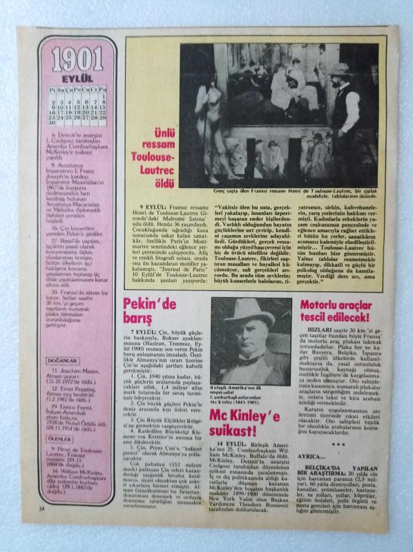 1901 = ( Temmuz-Ağustos-Eylül ) - Jöntürk kelimesi yargılanıyor • Vatikan bağımsızlık peşinde • Motorlu araçlar tescil edilecek • Mc Kinley'e suikast • Pekin'de barış ~ [ Çift taraflı ]