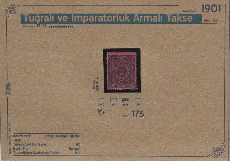 1901 Tuğralı ve İmparatorluk Armalı Takse Pulu MNH ** Damgasız İSfila 175 Özel Hazırlanmış havidli kartelasında gönderimi yapılacaktır. Fotoğraf Stok Fotoğraf olabilir. Kesinlikle Eşit kondisyon Ürün Gönderilecektir. Diğer ürünlerimize bakmanızı öneririz.