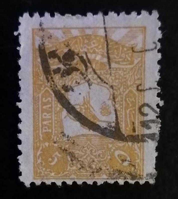 Osmanlı İmparatorluğu dönemine ait 1901 serisi (II. Abdülhamid Tuğralı) "Dahili Posta" (iç hatlar) puludur. Üzerinde sarımsı/toprak rengi tonlarında basılmış olup, 5 Para değerindedir. Damgalı (Kullanılmış) Tek Pul: Fotoğraftaki gibi kullanılmış bir örneğin piyasa değeri kondisyonuna (fiziksel durumuna) bağlı olarak 30 TL ile 60 TL arasındadır.