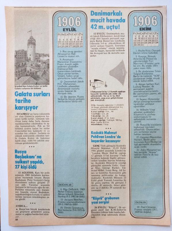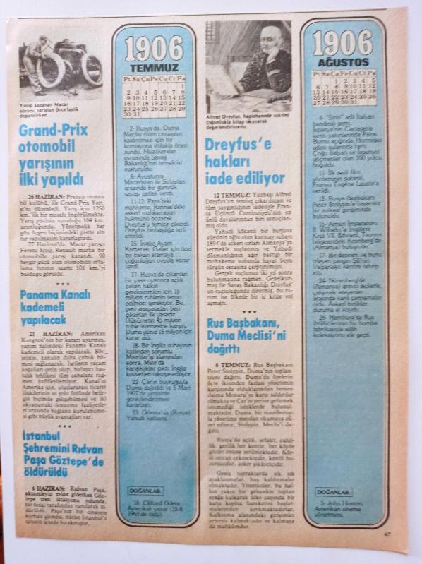 1906 = ( Temmuz-Ağustos-Eylül-Ekim ) - Grand-Prix otomobil yarışının ilki yapıldı • Panama kanalı kademeli yapılacak • Rus Başbakanı Duma Meclisi'ni dağıttı • Galata surları tarihe karışıyor • Danimarka'lı mucit 42 m. uçtu ( Çift taraflı ) ~ Ebat : 19 X 25, en son 1 yıl önce güncellenmiştir.