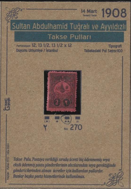 1908 Sultan Abdulhamid Tuğralı ve Ayyıldızlı Takse Pulları isfila 270 MNH Damgasız Özel Hazırlanmış havidli kartelasında gönderimi yapılacaktır. Fotoğraf Stok Fotoğraf olabilir. Kesinlikle Eşit kondisyon Ürün Gönderilecektir. Diğer ürünlerimize bakmanızı öneririz.