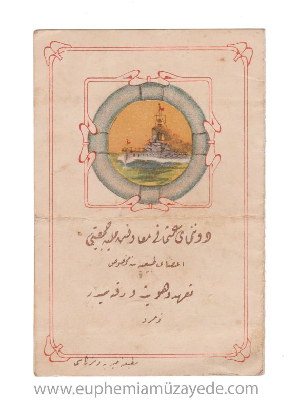 1910 Osmanlıca "Donanma-yı Osmânî Muâvenet-i Milliye Cemiyeti azasına mahsus taahhüd ve hüviyet [kimlik] varakası" [NADİR KİMLİK] başlıklı ürün, Efemera, Müzik, Sinema > Belge ve Evraklar > Osmanlıca Belgeler kategorisi altında İkinci El olarak satılmaktadır.