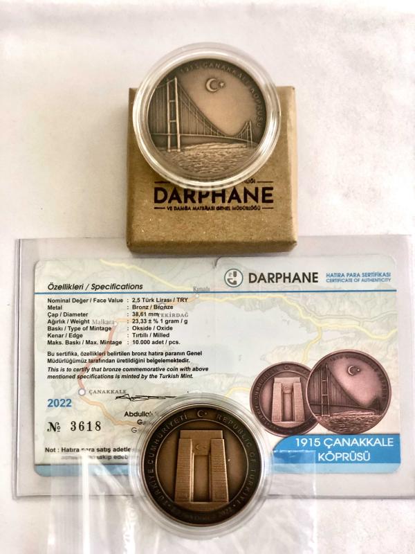 HATASIZ -YENİ DARPHANE-SERTİFİKALI 1915-ÇANAKKALE Köprüsü BRONZ oxide Renk 23.33 gr Bronz Hava Geçirmez KAPSÜLÜNDE- HATIRA/Sınırlı Basım.. El değmemiş Hatasız ürünler.. (1 adet Kapsüllü BRONZ,poşeti+pvc li Sertifikası,+Karton kutusu,)