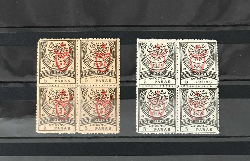 SÜRŞARJLI HARB EMİSYONU PULLARI ( 1917 ) 1886 AYLI ( AMPİR ) POSTA PULLARI ÜZERİNE ( BOYNUZ SÜRŞARJ ) İSFİLA KATALOG NO 754 4’LÜ BLOK ( KALIN KOYU KAĞIT - İNCE AÇIK KAĞIT )