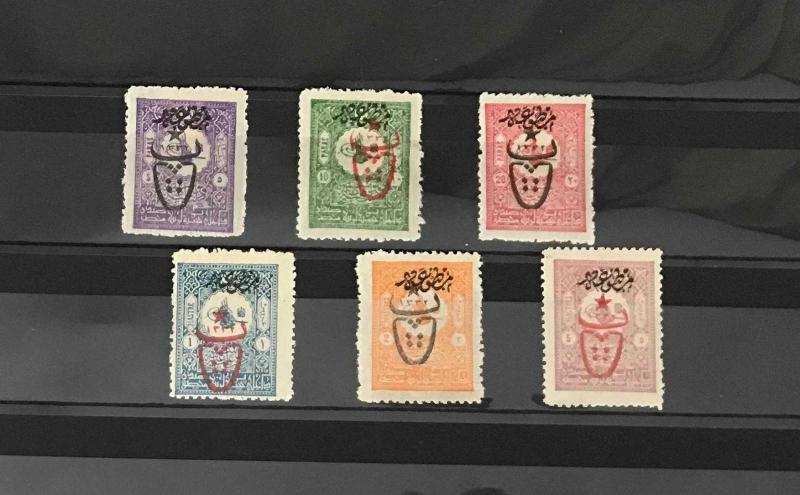 SÜRŞARJLI HARB EMİSYONU PULLARI ( 1917 ) 1901 SÜRŞARJLI DAHİLİ MATBUA PULLARI ÜZERİNE ( BOYNUZ SÜRŞARJ ) İSFİLA KATALOG NO 776-777-778-779-780-781 TAM SERİ