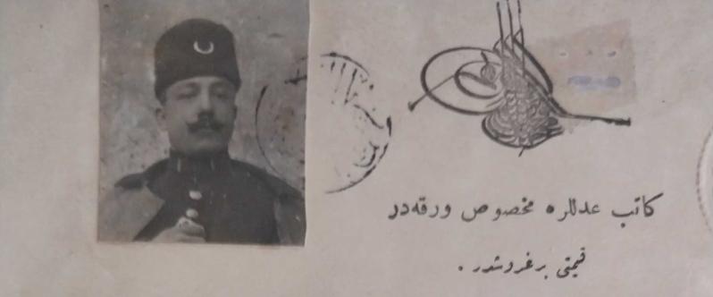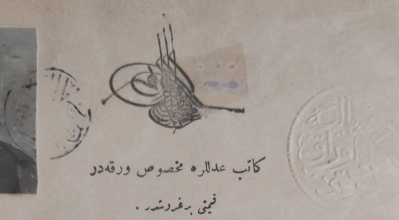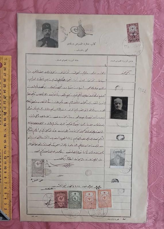 Osmanlı'nın son dönemine ait olup, bir tür vekâletname veya mali taahhütname niteliğindedir. Üst bölümde: Osmanlı tuğralı damga başlığı ve 1 kuruşluk kırmızı tuğralı pul. Alt bölümlerde: Daire mühürleriyle toplam 5 tuğralı damga pulu (farklı değerlerde). Üç portre: Sol üstte fesli bir Osmanlı subayı ya da memur (muhtemelen yetkili veya tanık), Ortada yaşlı bir erkek (muhtemelen mal sahibi ya da borç veren), Altta genç bir erkek (muhtemelen alıcı, kiracı veya vekil). Fotoğrafların altında her birinin el yazısı imzası veya parmak mührü yer alıyor. Belge 38× 24 cm boyutlarında,resmî kâğıt üzerine rik‘a hattıyla yazılmış. Metin sonunda, Kâtib-i Adalet Fehmi Bey’in dairesel mühürü yer alır. 1920 yılı, Osmanlı Devleti’nin siyasi olarak son evresidir — İstanbul işgal altındadır, ancak hukuk ve ticari yaşam, hâlâ Osmanlı düzeniyle yürümektedir. Bu belge, tam da o geçiş anının tanığıdır. Bir yandan Osmanlı tuğrası ve fesli portreler, diğer yandan modern vesikalık biçimi, eski imparatorluk düzeni ile yaklaşan Cumhuriyet’in bürokratik modernizmi arasındaki sembolik sınırı temsil etmektedir. Fotoğraflı, tuğralı ve mühürlü yapısı sayesinde hukuk tarihi, fotoğraf tarihi ve Osmanlı bürokratik sanatı açısından birinci derecede kaynak niteliğindedir. Cumhuriyet öncesi döneme ait, üç kişilik görsel kimlik içeren noter sözleşmeleri son derece nadirdir. Bununla beraber belgenin arkasında Türkçe TC İstanbul Noteri damgası ve bugün kullanılan nitelikte evrak numarası vardır.Belge belki Cumhuriyetle birlikte yeniden tasdik edilmiş olabilir. Haliyle.Tercüme ve tarih hataları olabilir.