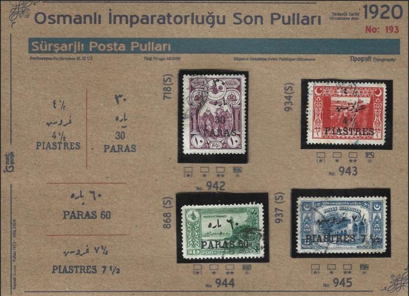 1920 Osmanlı İmparatorluğu Son Pulları, Sürşarjlı Posta Pulları, İsfila 942 - 945 Damgalı Tam Seri Özel Hazırlanmış havidli kartelasında gönderimi yapılacaktır. Fotoğraf Stok Fotoğraf olabilir. Kesinlikle Eşit kondisyon Ürün Gönderilecektir. Diğer ürünlerimize bakmanızı öneririz.