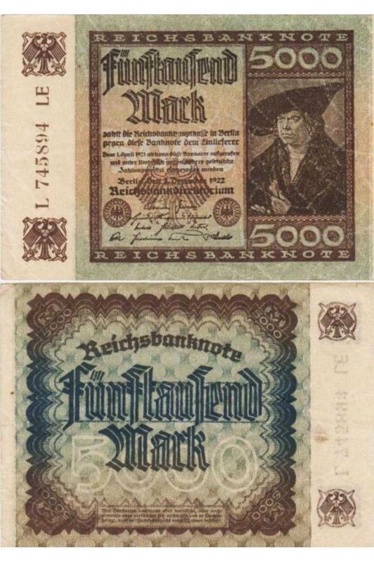 1922 Alman 5000 Mark Banknot Temiz.; Orijinal dönemine ait.