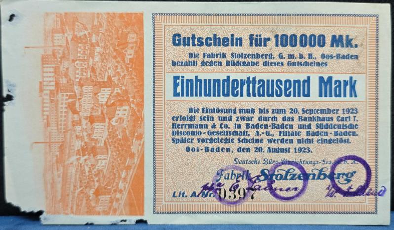 1923 Almanya Oos-Baden Stolzenberg Eyalet Parası 1 Milyon Mark, Alt ve Sol Kenarda Hasar Var, 13 gün önce satışa sunulmuştur.