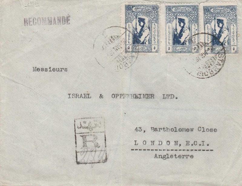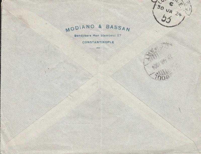 1924 Tarihli, Cenova 5 Kuruş x3 Pullu, İstanbul'dan Londra'ya gönderilmiş Modiano & Bassan Constantinople Antetli Taahhütlü zarf. NADİR, bir ay önce satışa sunulmuştur.