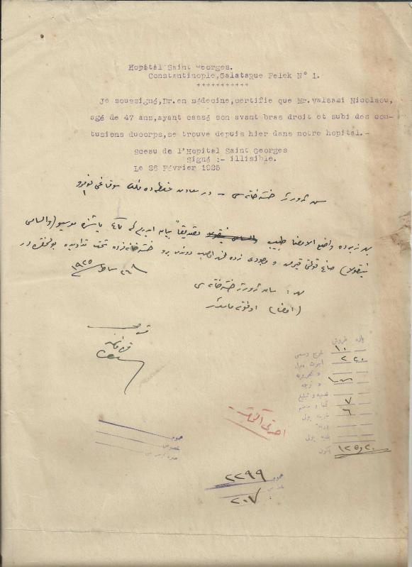 ** SAINT GEORGES HASTANESİ YAZIŞMA ** Tercümesi yapıldı : 47 yaşında bir erkeğin tedavisi için yapılması hususunda yazı.. Galata St.George Avusturya Hastanesi'ne yazılmış. Şahsın adı : Valsami Nicolau.. 1925 tarihli,gayet iyi kondüsyonda, 28 x 21.5 cm. A4 ebadında filigranlı kağıtta Osmanlıca ve Latince yazılmış hastane konulu yazışma...