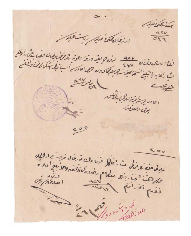 Orijinal el yazısı Osmanlıca mahkeme belgesi. 18x14 cm. Tamamı Osmanlıca. Mühürlü ve imzalı. Muamele metinleri mevcuttur. Alt kısımda Erzincan Mahkemesi'nce yazılmış cevabı mevcuttur.
