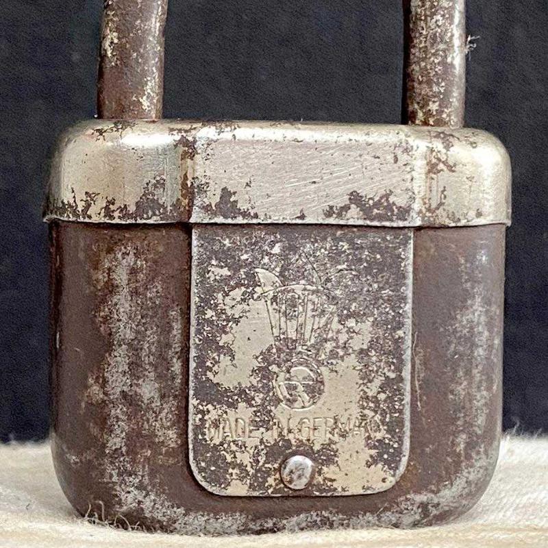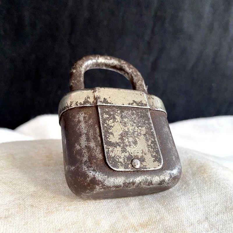 1930'lardan Alman çelik endüstrisinin kalbi Solingen'den Isaac Wester&Co doküm çelik asma kilit. Dekoratif endüstriyel obje koleksiyonerleri için nadir bir aksesuar olan kilidin gövdesinde, markanın tescilli "Daire içinde W ve Sur Tacı" (Wester & Co.) logosu ve altında "MADE IN GERMANY" damgası bulunuyor. Ağır hizmet tipi kilit, yaşına göre iyi durumdadır. Anahtarı bulunmuyor. Yüzeyinde çok güzel bir eski metal patinası var, herhangi bir kırık vs yoktur. Metal bakımı yapılmıştır. 120 gr
