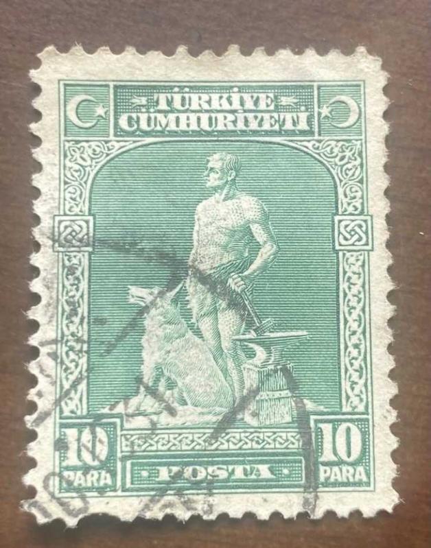 Ergenekon Destanı'ndan esinlenen bir temayı işleyen 1930 Londra baskısı Türk posta pulu. Pulun üzerinde demir dağı eriten demirci ustası ve ona rehberlik eden Bozkurt figürü bulunmaktadır.