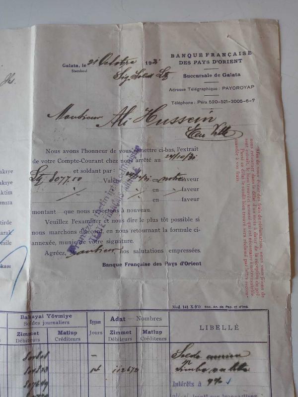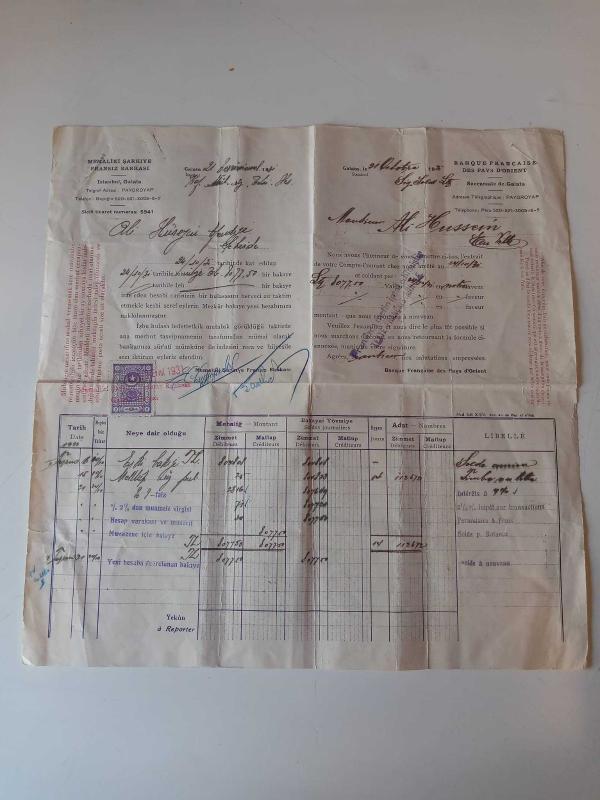 ** 1931 MEMALİKİ ŞARKIYE FRANSIZ BANKASI BÜYÜK BOY EVRAK ** 21 Teşrinievvel 1931 tarihli,Memaliki Şarkıye Fransız Bankası Galata Şubesi, çok temiz durumda,monsinyör Ali Hüseyin Efendi'nin hesaplarıyla ilgili, bir adet Osmanlı fiskal pullu,Türkçe ve Fransızca olmak üzere iki lisanda evraktır... Ebat : 31 x 31 cm.dir...