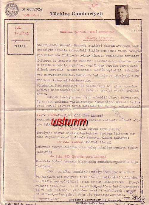 ** 1931 TAYYARE LOGOLU OSMANLI BANKASI NOTER EVRAĞI ** Mehmet Refik Bey imzasıyla düzenlenmiş, 30 Kanunievvel 1931 tarihli,fotoğraflı,iyi kondüsyonda noter evrağıdır... Osmanlı Bankası stajyeri olan beyin masrafları konuludur.. İki sayfadır...