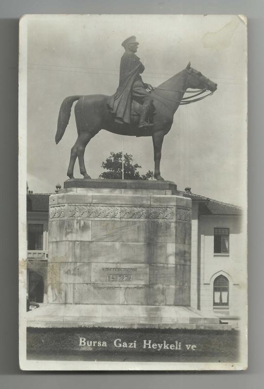 ** 1936 BURSA GAZİ HEYKELİ KONULU POSTADAN GEÇMİŞ FOTOKART ** 14 x 9 cm.ebadında,arkası yazılı ve postadan geçmiş, kondüsyon olarak gayet iyi,orijinal eski fotokarttır...